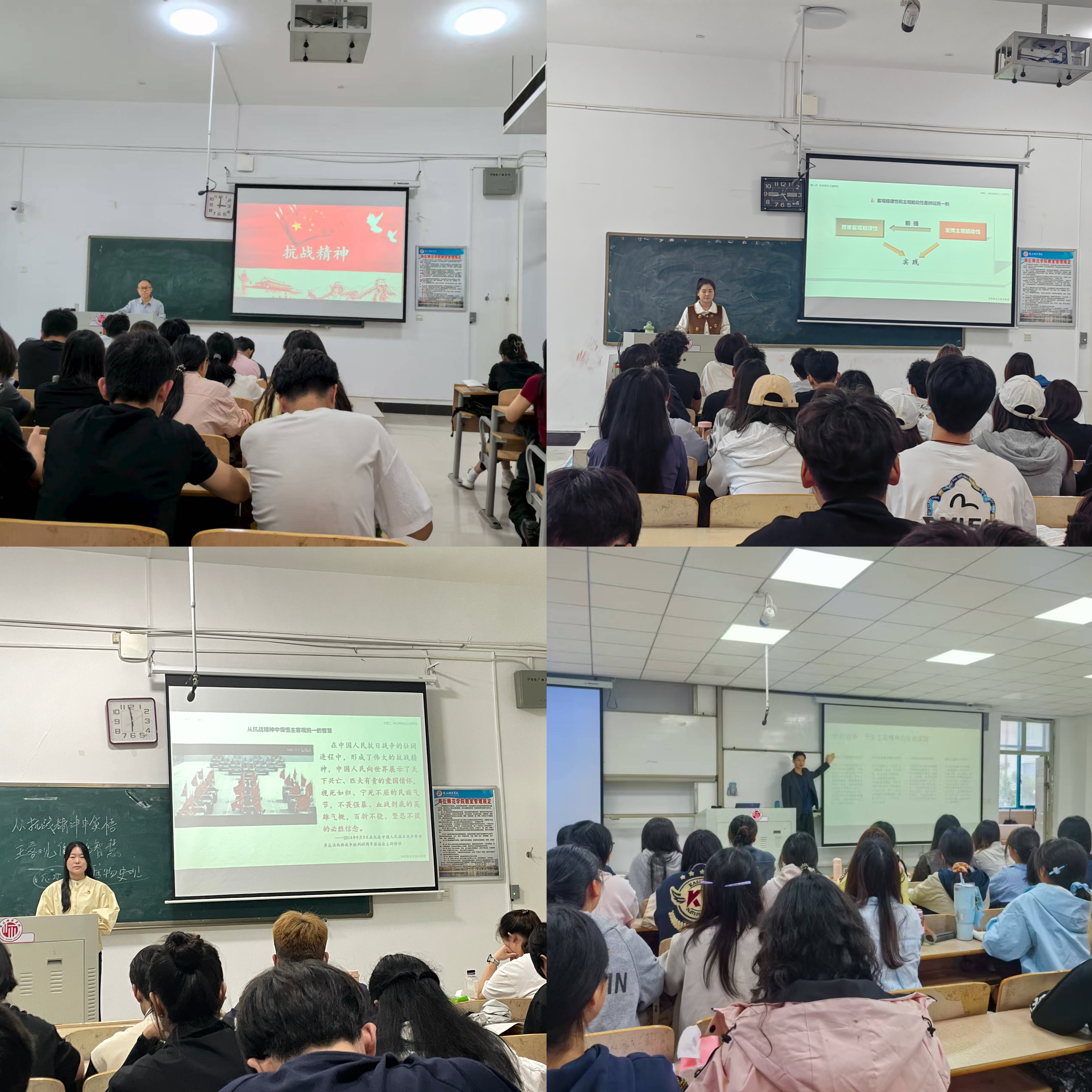 高原老师结合原理课第一章“世界的物质性及发展规律”中的“主观能动性和客观规律性的辩证统一”方面内容,详细讲述了“历史主动精神”,即:抗战精神闪耀着马克思主义历史主动思想的真理光芒。中国人民在中国共产党的引领下奋起抗争,以惊人的历史创造力突破困境,自觉把握历史规律,用顽强奋斗重塑民族命运。这场波澜壮阔的斗争实践,完美印证了“人民是历史的创造者”这一科学论断,展现了中华民族在危急存亡关头敢于斗争、善于创造,在历史洪流中开辟复兴之路的伟大智慧与勇气。