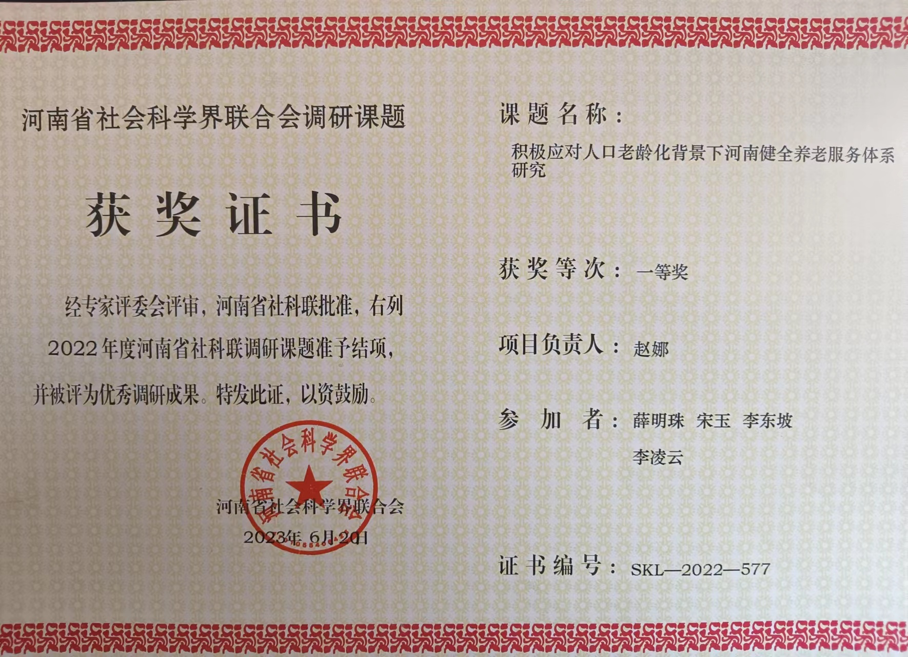 近日,beat365正版唯一官网赵娜博士主持的2022年度河南省社科联调研课题“积极应对人口老龄化背景下河南健全养老服务体系研究”经过河南省社科联批准,予以结项,被评为优秀调研成果一等奖。