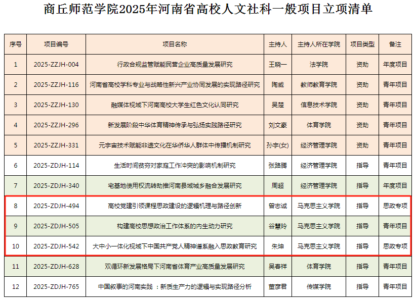 6月17日,河南省教育厅正式发布了关于下达2025年度河南省高校人文社会科学一般项目立项计划的通知。beat365官网的曾志诚、谷慧玲、朱坤三位老师的研究项目成功获得了立项,分别是曾志诚老师的《高校党建引领课程思政建设的逻辑机理与路径创新》,谷慧玲老师《构建高校思想政治工作体系的内生动力研究》,朱坤老师的《大中小一体化视域下中国共产党人精神谱系融入思政教育研究》。