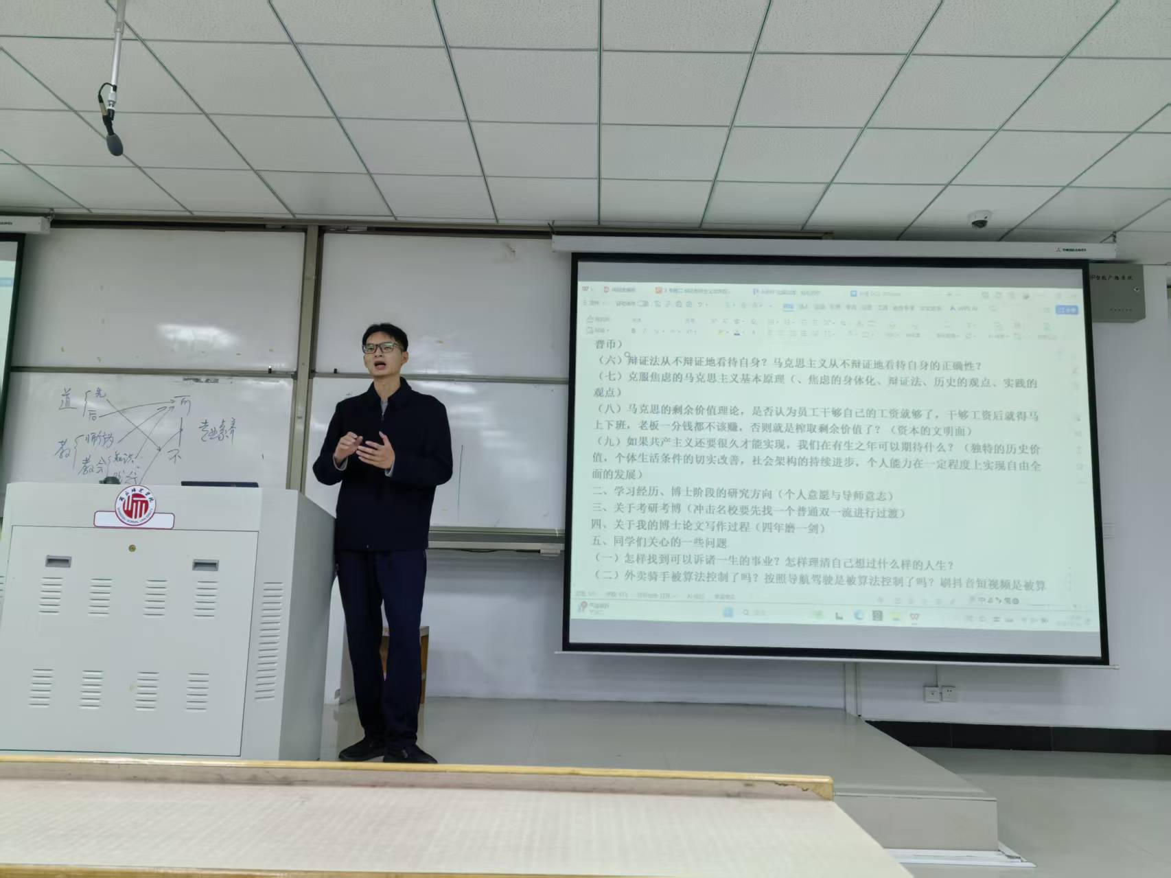 参加论坛的有思想政治教育专业2024级、2025级的全体学生。高原博士以《马克思主义怎样看?》为题,用风趣幽默的语言,现场演示了如何运用马克思主义基本原理深入剖析现实生活中遇到的各种具体问题。通过对“假期的时间流速问题”、“河南还是江南?”、“从修车、冷风到头痛”、“度的把握与耐得住寂寞”、“谷堆论证与秃子悖论”、“辩证法怎样辩证地看待自身?”等几个具体问题的分析,展现了唯物辩证法在现实生活中的具体应用;通过对“特朗普真的‘不靠谱’吗?”、“马克思的剩余价值理论是否认为员工干够自己的工资就够了?”等两个具体问题的分析,展现了马克思主义政治经济学在现实生活中的具体应用;通过对“如果共产主义还要很久才能实现,我们在有生之年可以期待什么?”等问题的具体分析,展现了科学社会主义理论在现实生活中的具体应用。高原博士讲解透彻,在深刻理论与真切实践之间架起了桥梁,为学生带来了一场生动的学术报告。讲座带给同学们的不仅是知识,更是马克思主义思维方法的现实应用,为同学们当下的学习生活与未来发展提供了宝贵指导。 (撰稿:高原;一审:孙喆;二审:司永海;三审:龚志宏)