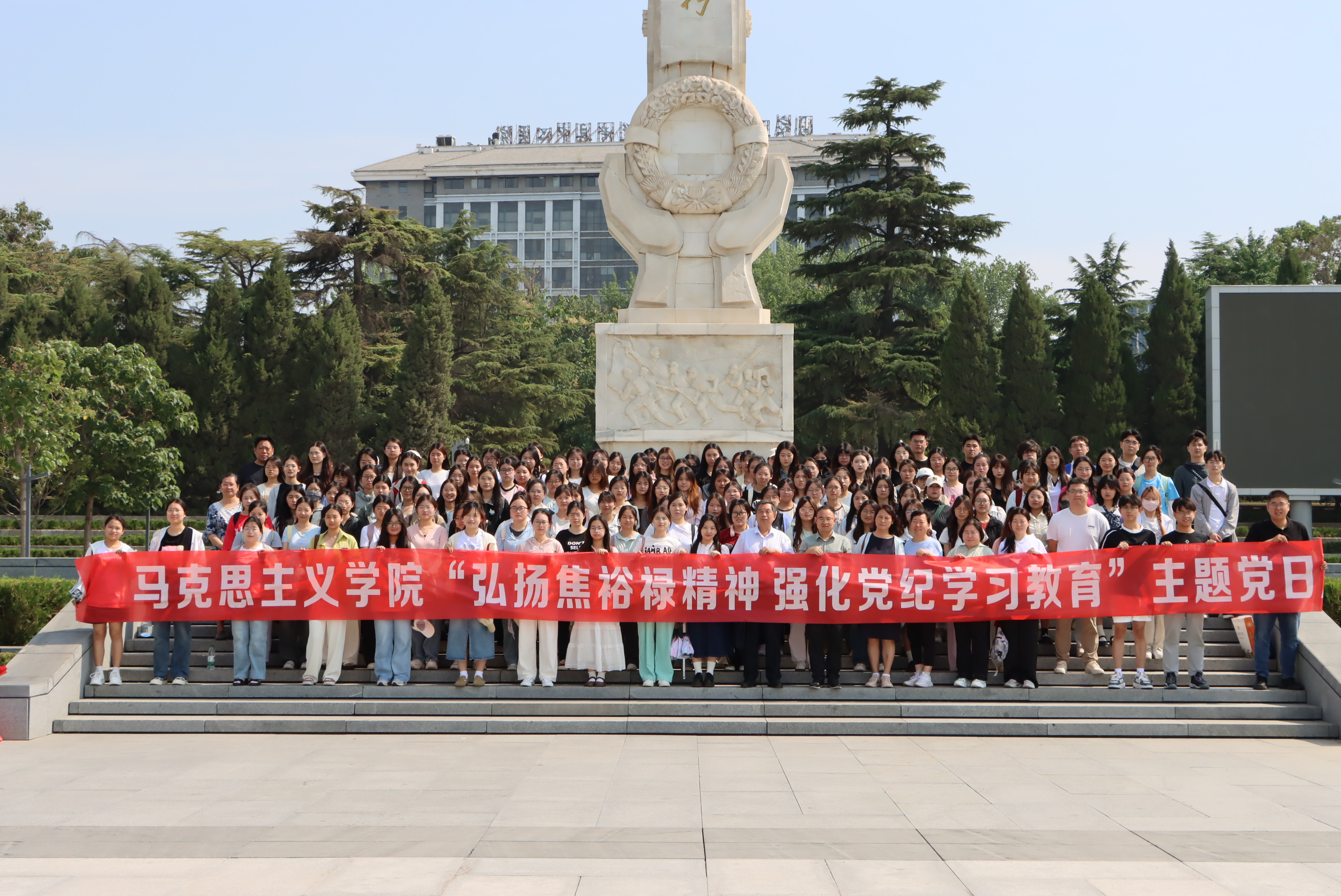 6月26日,beat365正版唯一官网学生党支部全体党员和入党积极分子100余人到兰考县焦裕禄纪念馆开展“弘扬焦裕禄精神,强化党纪学习教育”主题党日活动。在焦裕禄纪念园,全体党员和入党积极分子认真聆听工作人员讲解焦裕禄同志的感人事迹。学生党支部书记黄登科通过现场的图片和实物给学生党员上了一场“场馆里的思政课”。最后,全体党员面向党旗庄严宣誓,重温入党誓词。