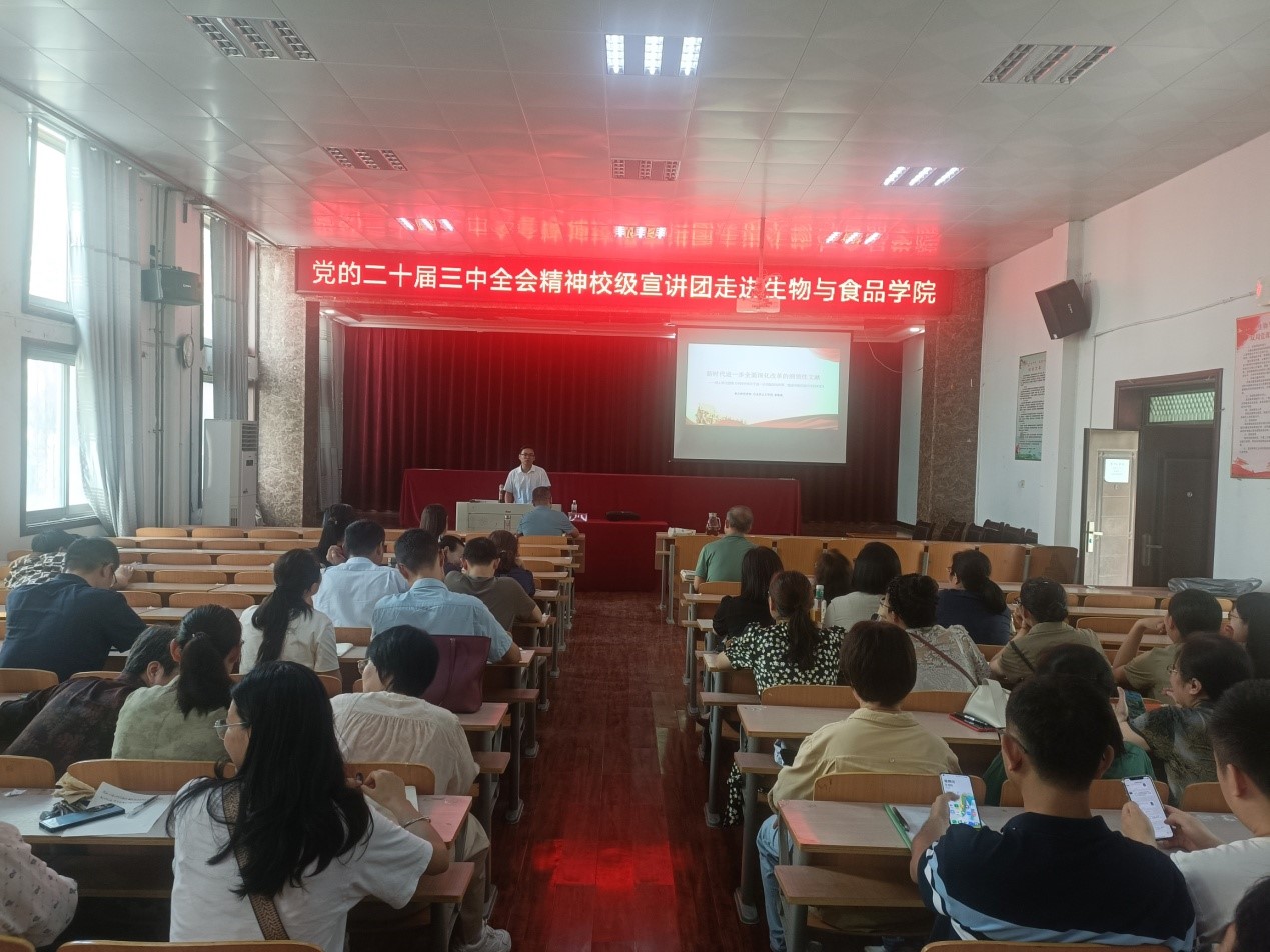 宣讲团成员、beat365正版唯一官网谢敏振博士以《新时代进一步全面深化改革的纲领性文件——党的二十届三中全会精神解读》为题,为生物和食品学院师生作党的二十届三中全会精神理论宣讲。宣讲主要从牢牢把握进一步全面深化改革的重大意义、总体目标、鲜明主题、重大原则、重大举措、根本保证、坚守底线七个部分剖析了《中共中央关于进一步全面深化改革、推进中国式现代化的决定》。