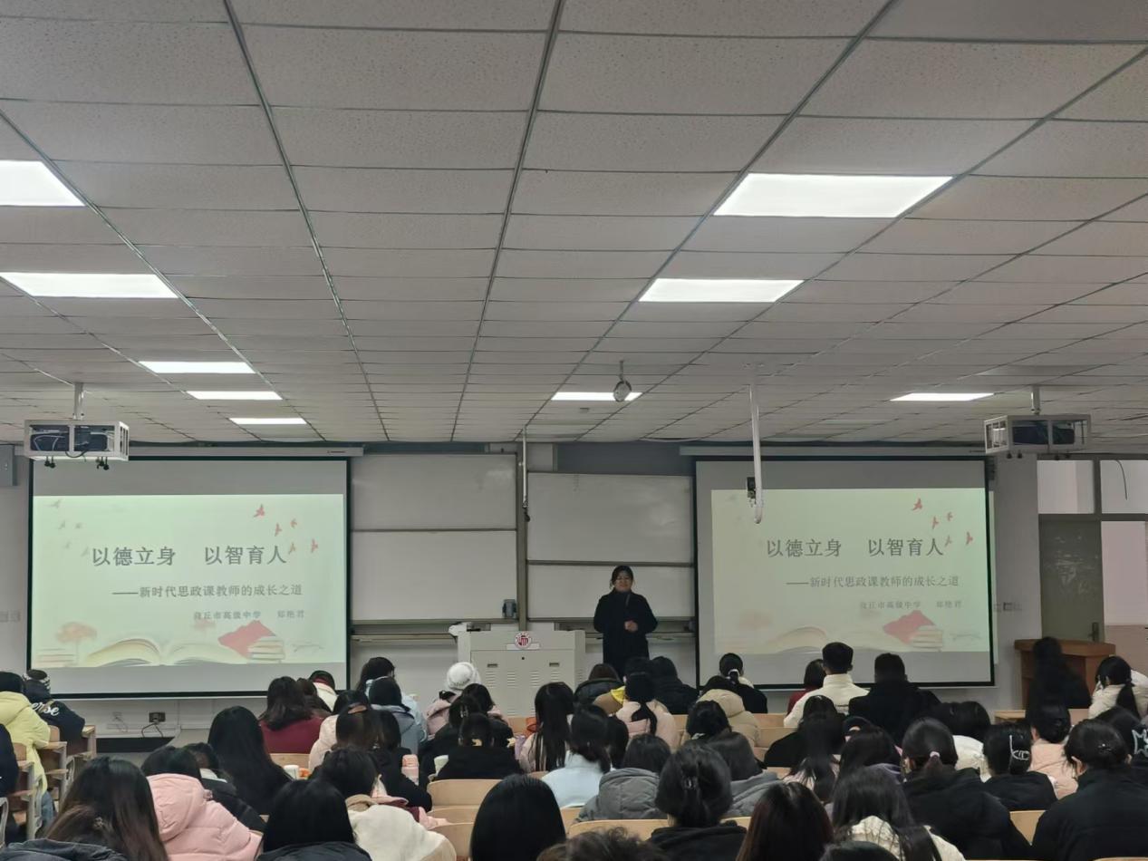 12月24日,beat365正版唯一官网邀请商丘市高级中学郑艳君老师在行方楼118教室进行一场以“以德立身,以智育人”为主题的报告。此次报告是beat365正版唯一官网思想政治教育专业2024年秋季学期认知实习的重要安排,报告围绕新时代党的教育方针,深入探讨了思政课教师在新时代背景下的角色定位与专业成长。