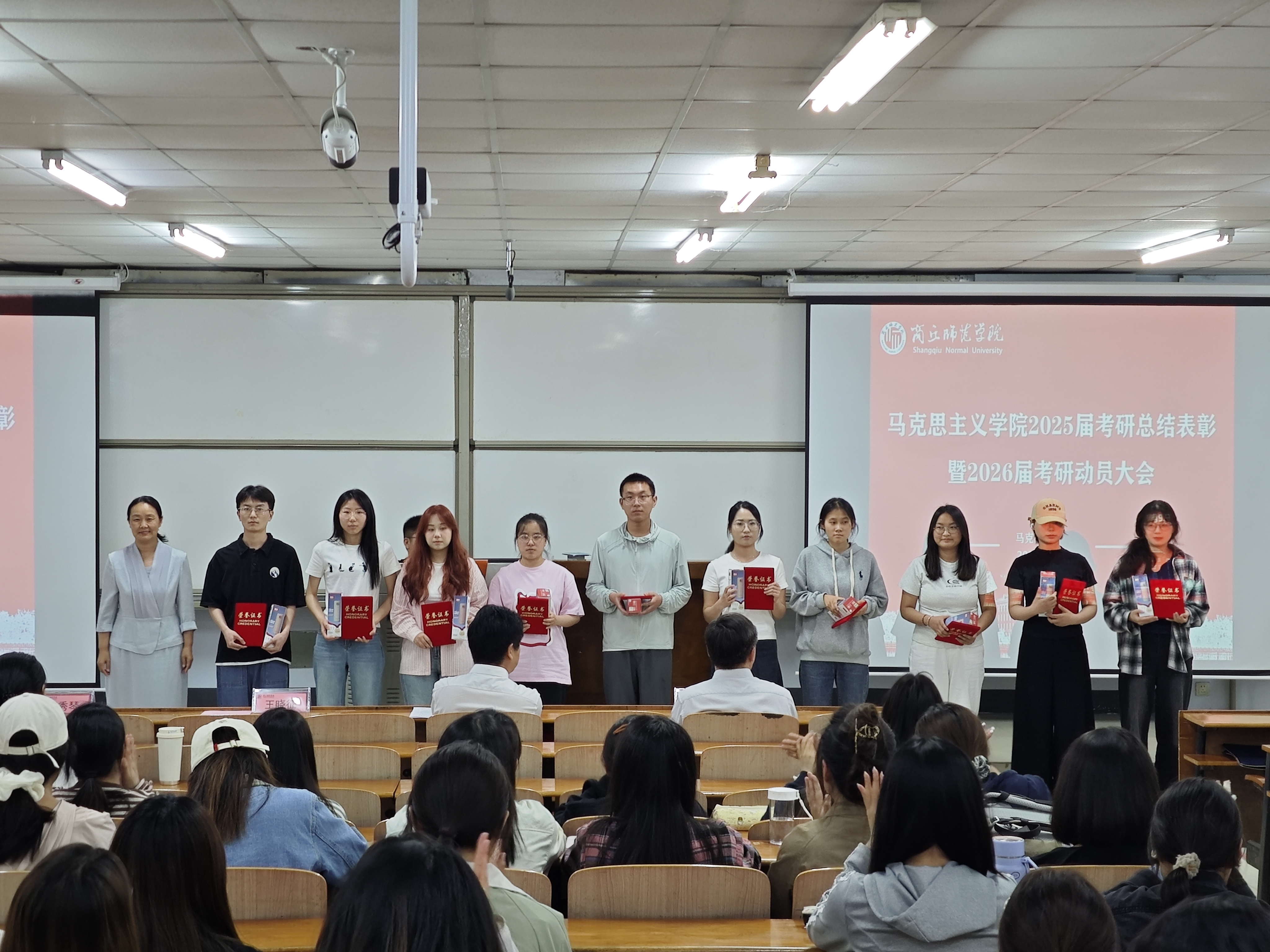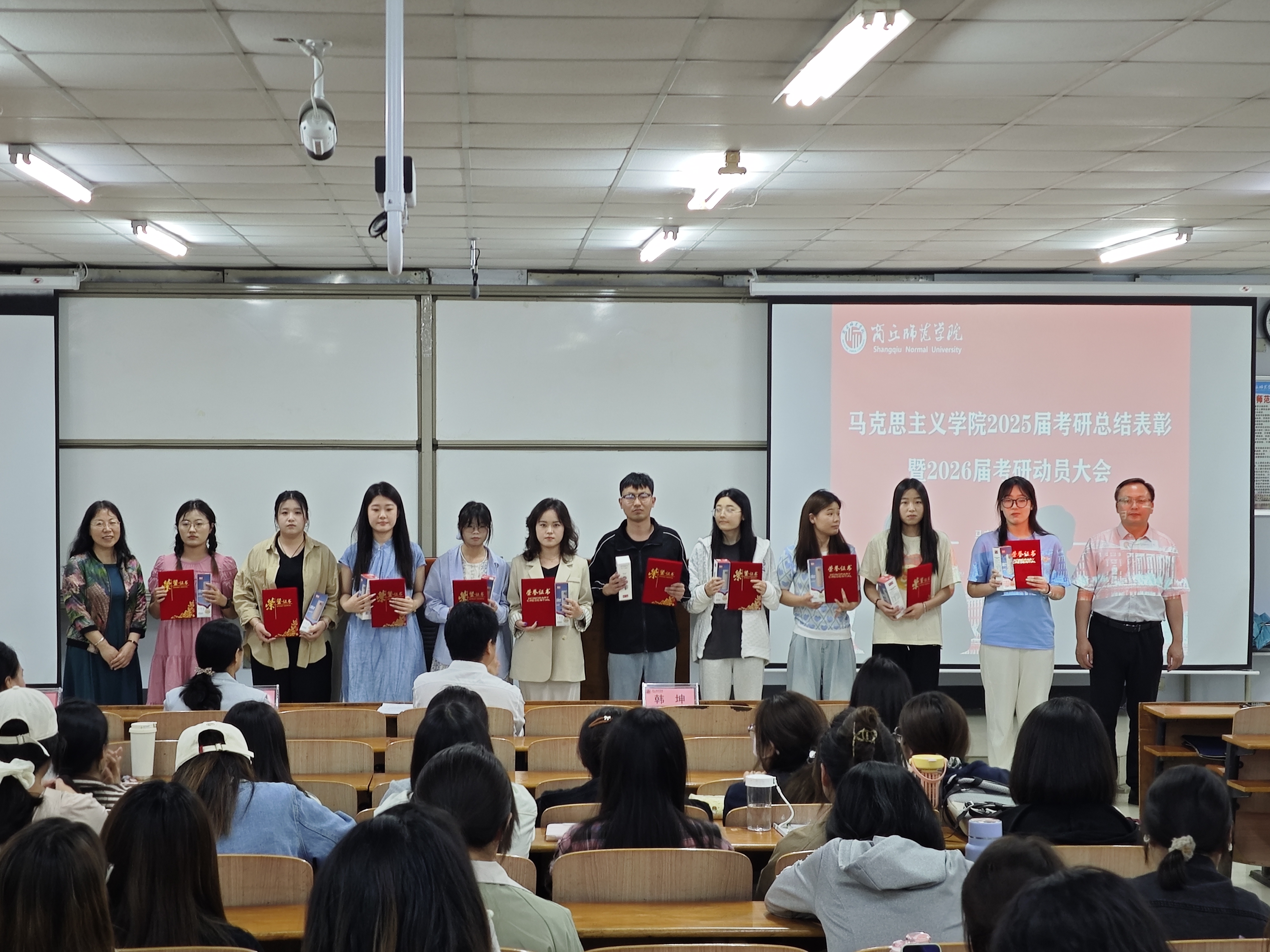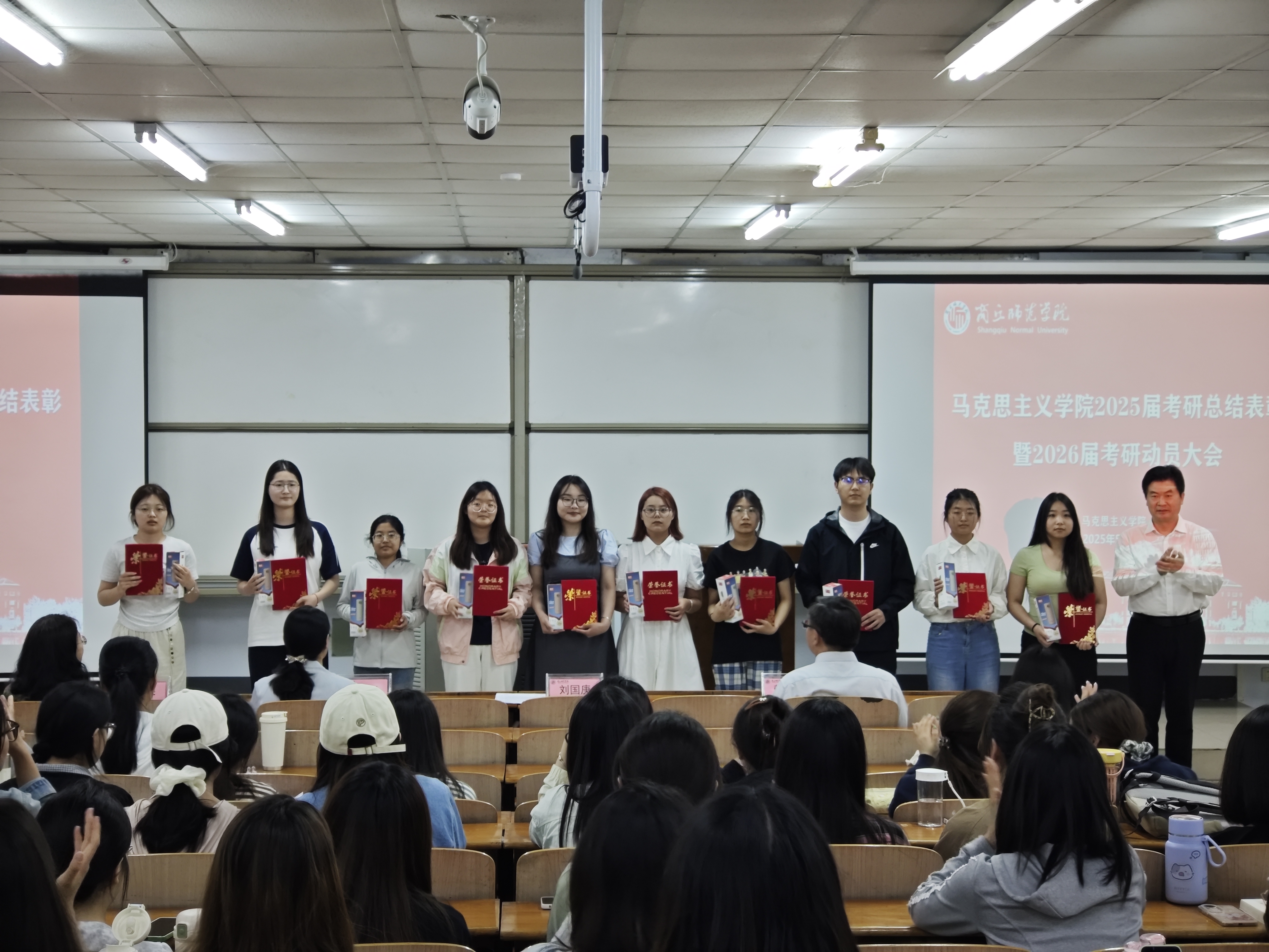 校领导、学校职能部门领导和beat365正版唯一官网党政主要负责人为受表彰同学颁奖。2025年考研上岸同学刘会豪、吴亚鹏、刘晴分别作考研经验分享。