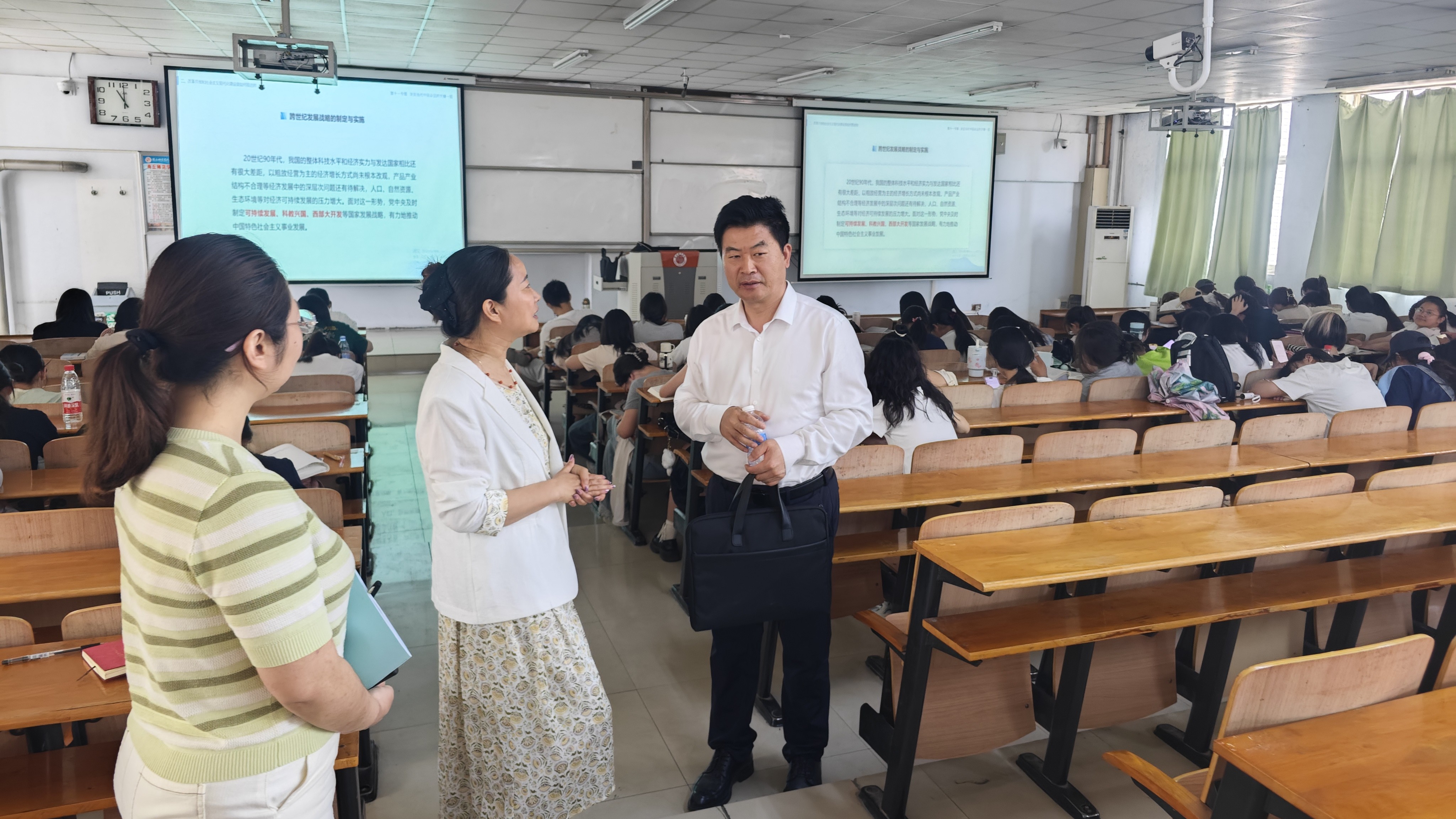 课堂教学结束后,刘国庚第一时间与授课老师展开深入交流。他向老师了解了《中国近现代史纲要》的课程概况、集体备课情况以及实践教学情况,并围绕如何推进高校思政课内涵式发展、如何激发学生课堂积极性、如何提升青年教师教育教学能力等方面问题提出建设性意见。两位老师表示要不断夯实马克思主义理论功底、历史文化素养、教学方式方法、学情分析能力,以教育家精神为引领,进一步提高思政课教学质量。