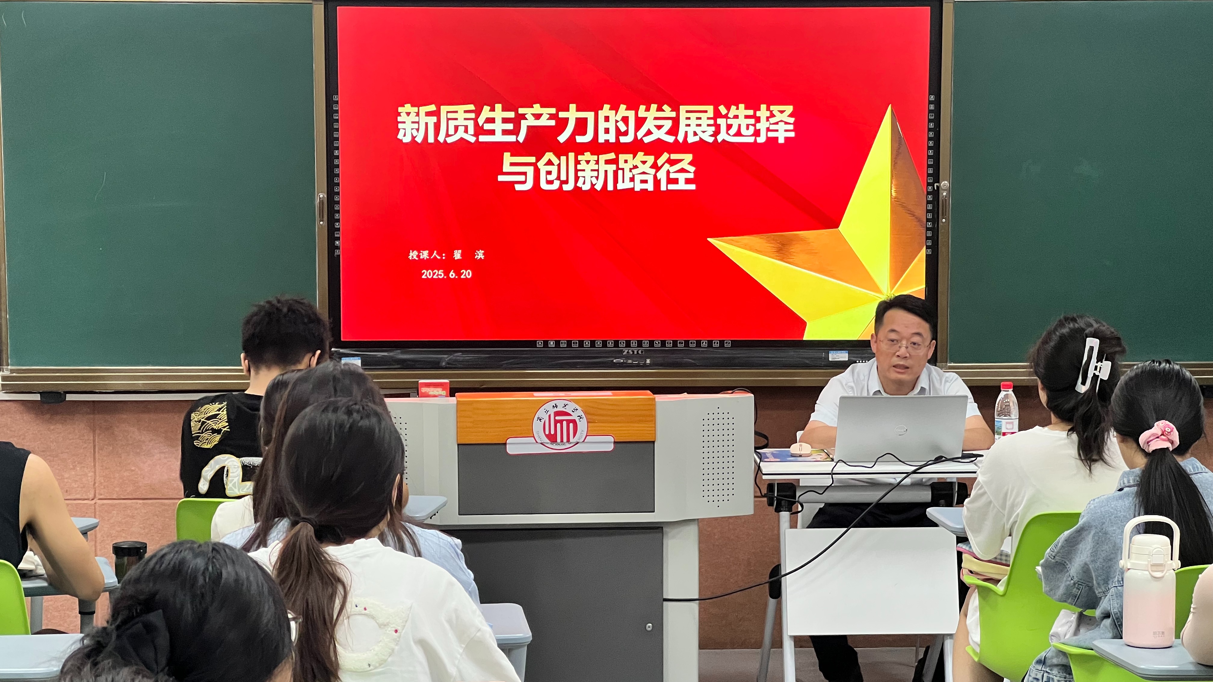 6月20日,副校长翟滨在睢阳校区1号楼111教室为化学化工学院学生代表讲授《新质生产力的发展选择与创新路径》专题思政课。翟滨聚焦传统模式困局凸显、国际循环贡献式微、殖民掠夺非我道路、科技赋能破局关键四个问题,系统回答了新质生产力为什么是中国高质量发展的必然选择。从新能源等“五大版块”、理论创新等“五个层次”、人形机器人等“五类产品”,详细阐述了科技创新是实现新质生产力的核心要素,描绘了推动新质生产力的实践路径,鼓励学生在奋力谱写中原大地推进中国式现代化新篇章中挺膺担当。