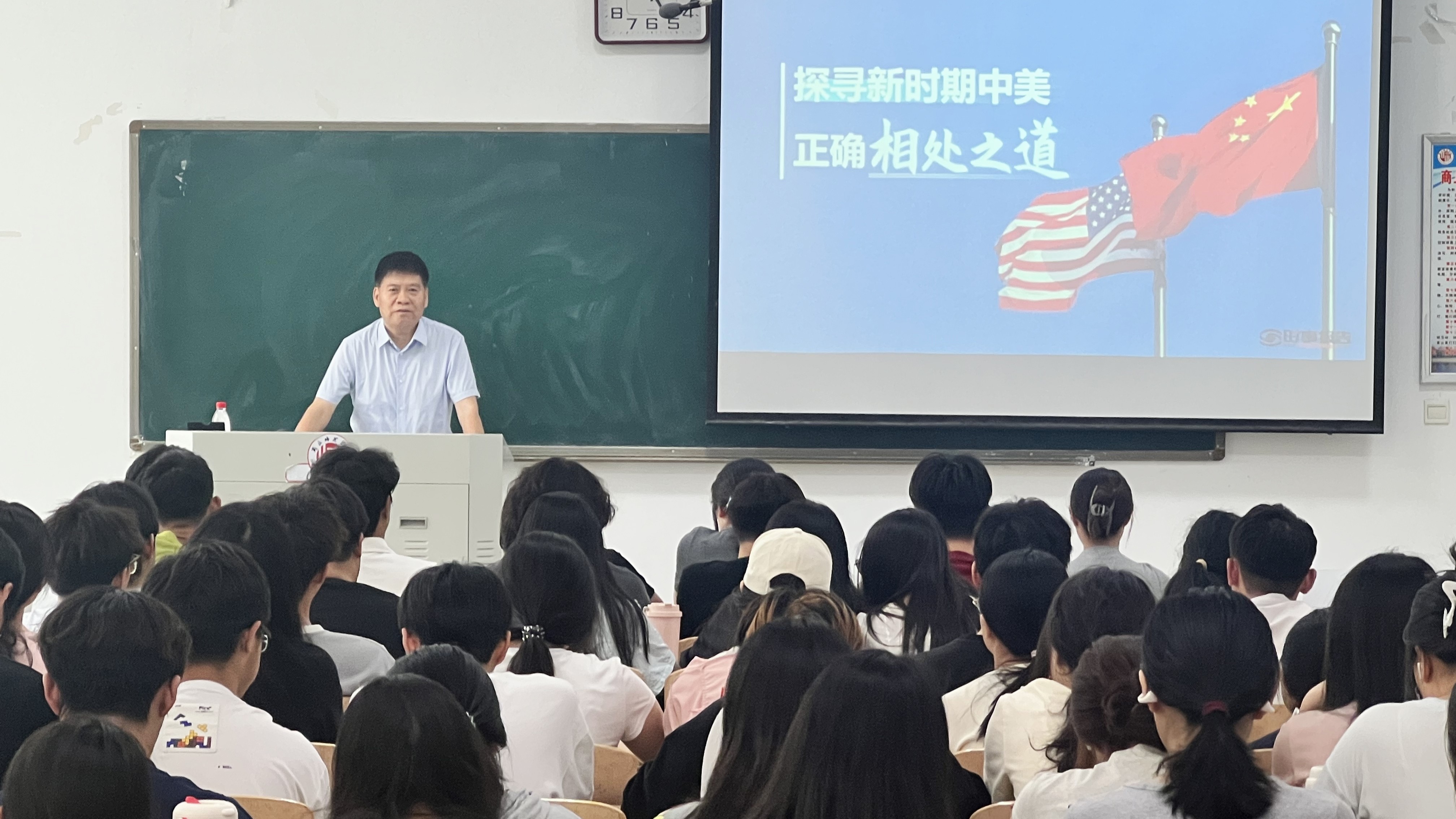 6月6日,校党委副书记吴金山到梁园校区行方楼102教室,为测绘与规划学院24级地理信息、园林等专业的101名学生上思政课,讲授《探寻新时期中美正确相处之道》。为上好这次思政课,吴金山挤出时间,收集了大量线上线下资料,扎扎实实备课。讲授过程中,立足课程定位,聚焦当下变乱交织的国际局势,着重阐述了中美关系历经跌宕起伏、特朗普再度执政的影响、解好中美关系的必答题等内容,对大家了解把握当前时事形势具有重要意义。