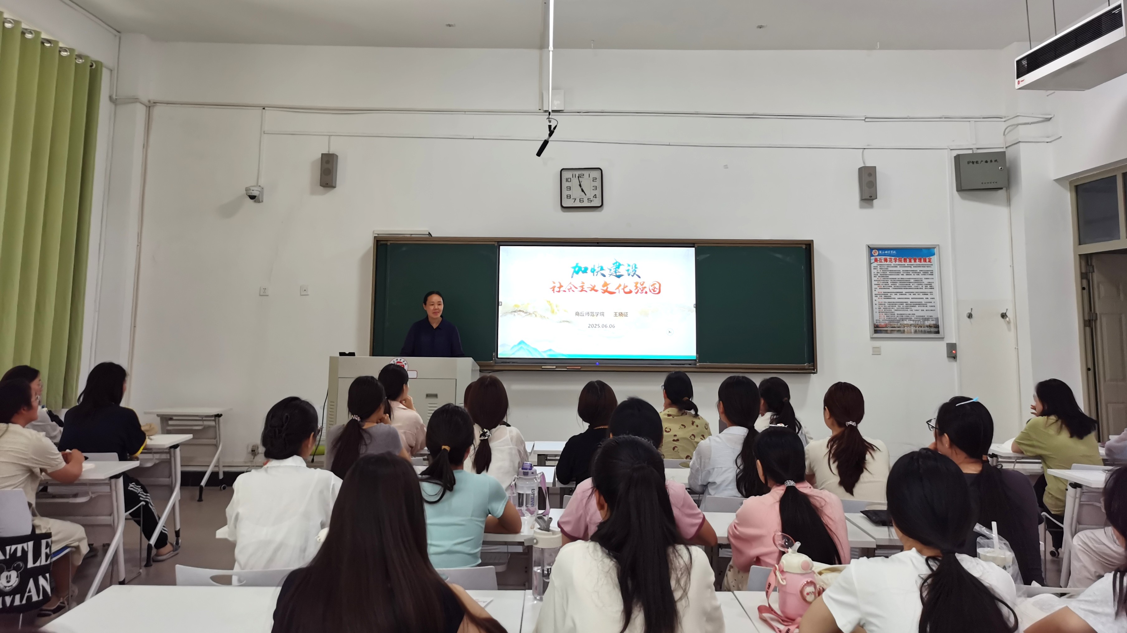 6月6日,副校长王晓征在行方楼327室为国际教育学院学前教育专业学生讲授了题为《加快建设社会主义文化强国》的思政课。王晓征从习近平文化思想的提出背景和主要内容进行破题,对“建设什么样的社会主义文化强国、为什么建设、怎么样建设”等若干维度进行系统讲解,深入阐述了加快建设社会主义文化强国的重要性和迫切性以及主要途径,生动阐释了习近平文化思想的重要指导意义,鼓励青年学生要把个人成长成才梦与国家的发展大势相融合,争做习近平文化思想的践行者、传播者,为加快建设社会主义文化强国、提升国家文化软实力和中华文化影响力贡献青春力量。