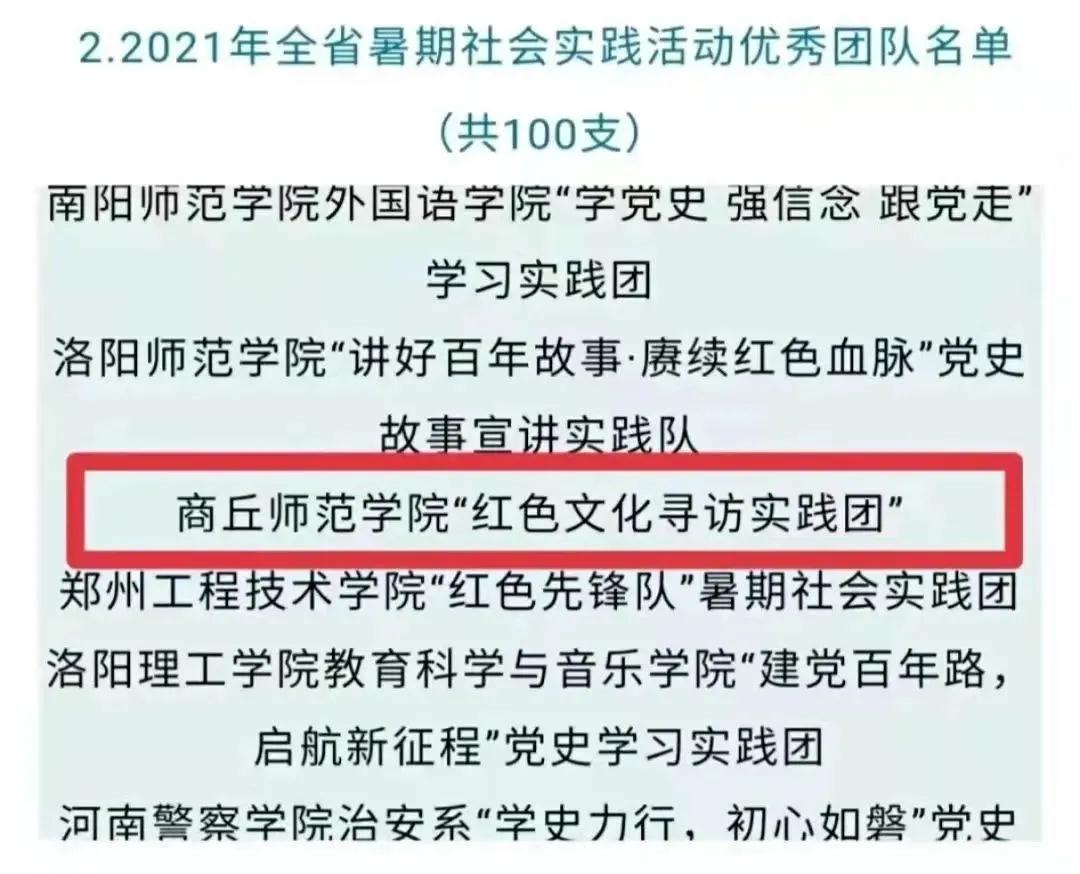近日,团省委对全省2021年暑期社会实践活动进行了总结,表彰了积极组织、指导和参与社会实践活动并取得优秀成果的团组织、实践单位、实践团队、品牌项目及个人。由beat365正版唯一官网2020级学生组建的beat365正版唯一官网“红色文化寻访实践团”获评省级优秀团队。