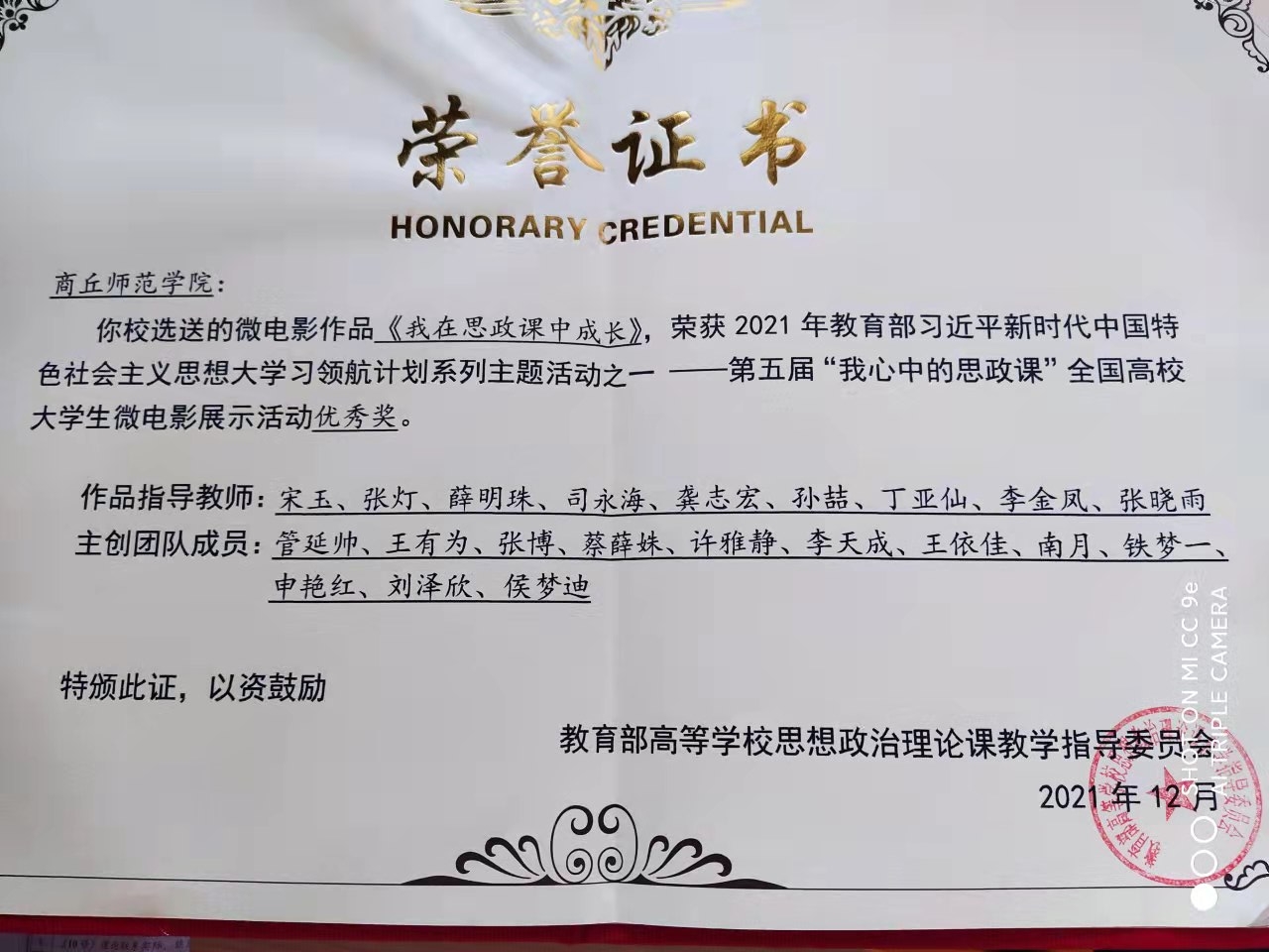 1月4日,第五届“我心中的思政课”全国高校大学生微电影展示活动获奖名单揭晓。由beat365正版唯一官网宋玉、张灯、薛明珠、司永海、龚志宏、孙喆、丁亚仙、李金凤、张晓雨等老师共同指导,由管延帅、王有为、张博、蔡薛姝、许雅静、李天成、、王依佳、南月、铁梦一、申艳红、刘泽欣、侯梦迪等同学联合创作的微电影《我在思政课中成长》,在全国高校报送的316部微电影作品中脱颖而出,荣获优秀奖。