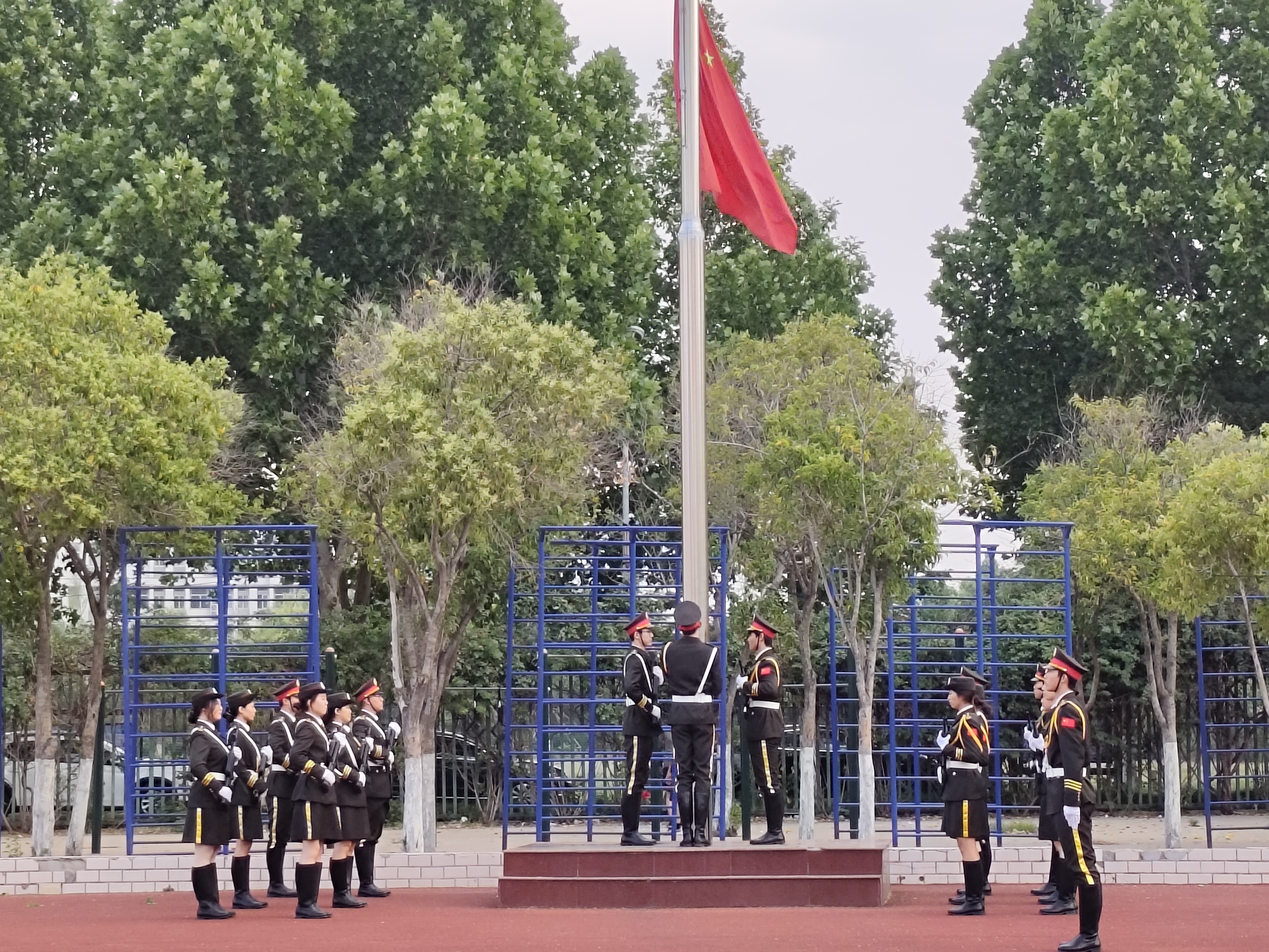 清晨7时整,伴随着初升的朝阳,英姿飒爽的国旗护卫队迈着整齐有力的步伐护送国旗入场。在雄壮的《义勇军进行曲》中,全体师生庄严肃立,注视着鲜艳的五星红旗冉冉升起,在晨风中高高飘扬。