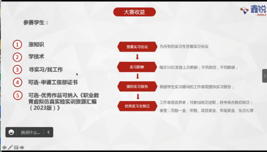 随后,团队成员李勐老师介绍了首届“鑫锐杯”虚拟仿真智能设计与开发大赛的大赛简介、报名方式、日程安排及咨询方式等。接着由课程设计中心赵书冉老师介绍了鑫锐系统平台的操作流程以及首届“鑫锐杯”虚拟仿真智能设计与开发大赛的大赛收益、虚拟仿真课程示例等。