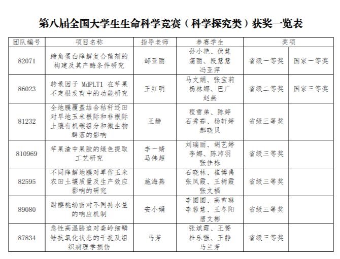 我校共有8支团队参赛,最终获国家一等奖1项、三等奖1项;省级一等奖1项、二等奖1项、三等奖5项。由3003新葡官方网站邹亚丽老师指导,孙小艳、伏慧、蒲丽、段慧慧、冯亚萍完成的《蹄角蛋白降解复合菌剂的构建及其产酶条件研究》项目荣获国家一等奖(省级一等奖);由3003新葡官方网站王红明老师指导,马文娟、张宝莉、杨林娜、巴广、赵燕完成的《转录因子MdPLT1 在苹果不定根发育中的功能研究》项目荣获国家三等奖(省级二等奖)。