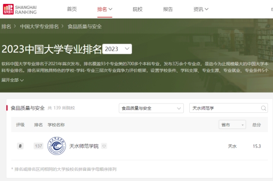 近日,高等教育评价专业机构软科发布2024中国大学专业排名,新葡官网食品质量与安全专业首次进入该榜单,全国排名与甘肃中医药大学、山东农业工程学院并列137位,专业评级为B,实现了历史性突破。该榜单的首次进入,表明食品质量与安全专业建设步入了快车道,实现了专业持续、快速发展。
