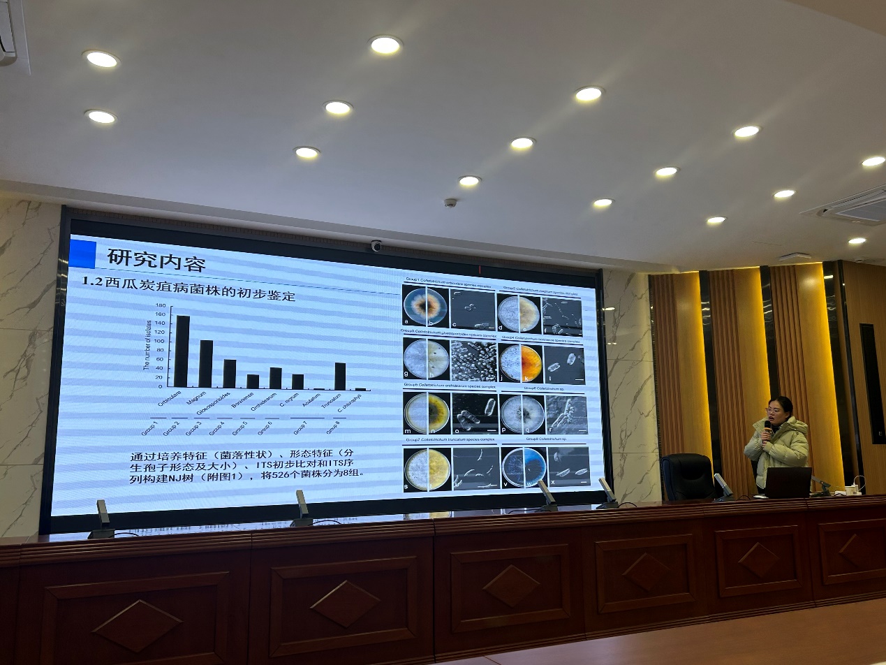 青年教师郭珍博士分享了《西瓜炭疽病病原的多样性》的研究成果,通过广泛的病原菌样本采集与多维度的分析鉴定手段,全面系统地阐述了西瓜炭疽病病原在生理生态及致病型分化等方面的多样性特征,为精准防控西瓜炭疽病提供了关键的理论依据与实践指导。