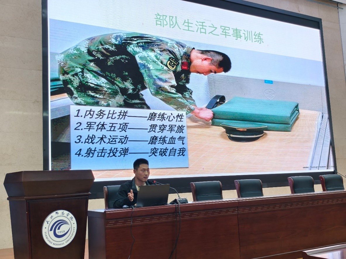 活动伊始,退役大学生士兵郭灵涛和赵婧彤分享了他们在部队两年的服役经历。郭灵涛从入伍后的部队生活、日常训练、情感收获和个人成长等方面分享了他的军营生活,并且对有意参军入伍的同学可能担忧的问题进行了分析和解答。赵婧彤则从她入伍之后获得的荣誉,日常训练中发生的有趣事情以及入伍之后对个人的成长帮助层面分享了她的军营生活。两位同学不约而同提到军营生活对他们意志品格的磨砺和团队精神的塑造,并且能够将部队培养的优秀品质延续到学业中。他们情真意切的分享引发全场热烈的掌声。