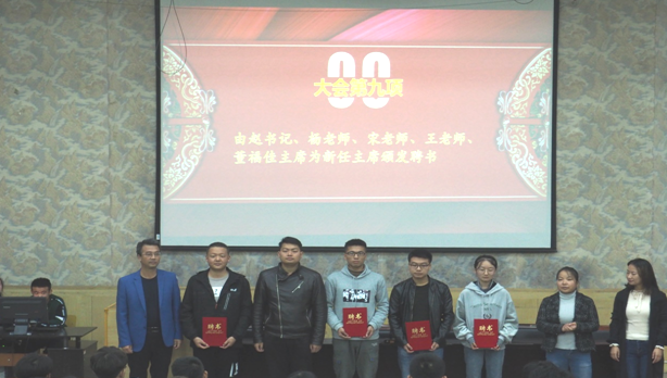 会议首先由上届主席董福佳对2018~2019学年学生会工作情况进行总结,他说回顾这一年在学生会工作的艰辛与喜悦,各部成员认真负责、团结协作,获得了老师和同学们的高度认可,希望下一届主席团成员扎实做好每件事,使学生会工作能更上一个台阶。接着6位候选人做了竞选演讲,阐述了自己的理念、经验以及对未来学生会的设想。秉持着公平、公正、公开的原则,由辅导员及同学投票,差额选举出主席团成员,最终选出刘耀威担任学生会主席,杨浩、赵腾、张凡、陈琳担任副主席,并给他们颁发了聘书。