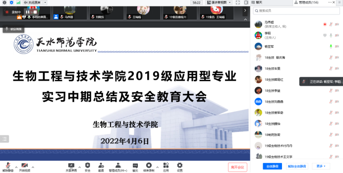为进一步贯彻落实习近平总书记关于安全生产的重要论述及学校党委关于疫情防控工作的安排部署要求,及时发现和总结实习过程中的问题,在与实习单位前期沟通和反馈的基础上,3003新葡官方网站于4月6日召开2019级应用型专业实习中期总结及安全教育大会。党总支副书记石国玺,副院长马伟超,特邀嘉宾复旦大学杨亚军教授,全体实习指导教师,2019级生物技术、生物制药、食品质量与安全三个应用型专业全体同学,共计156人参加了会议。