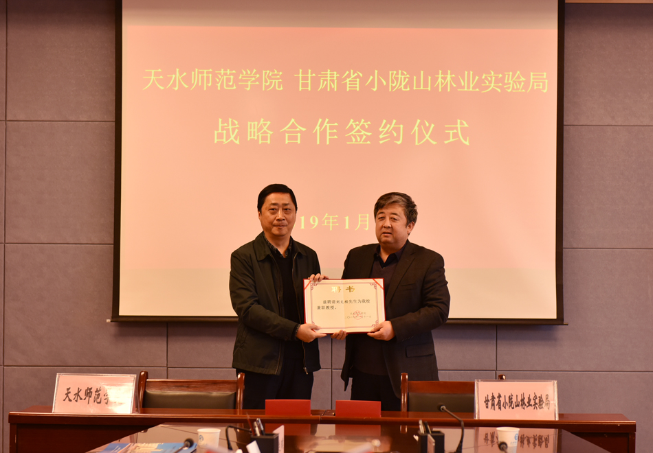 安涛向甘肃省小陇山林业实验局马建伟、刘文桢等正高级工程师颁发了兼职教授聘书。