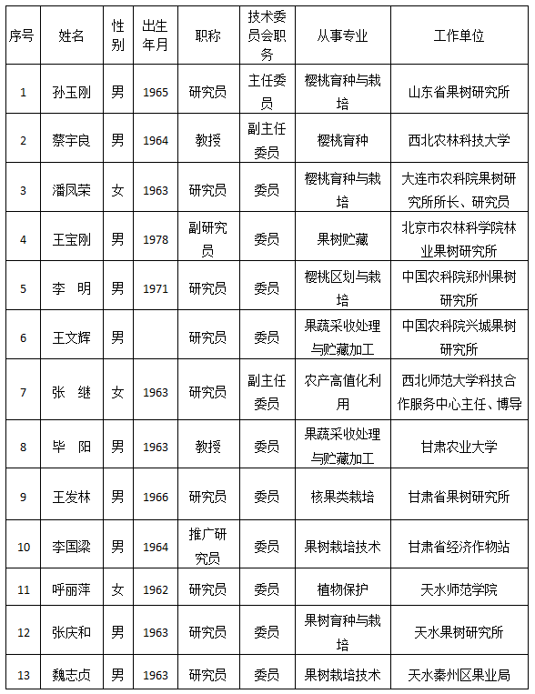 创新中心学术委员会由甘肃大樱桃技术创新中心专家和省内外从事樱桃研究的科研院所和高校的国内行业内知名专家组成。主要职能是负责审议技术创新中心的发展目标、研究方向、重大学术活动、年度报告、开放课题等。具体人员如下表所示: