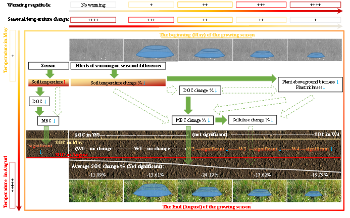 气候变暖和季节对土壤有机碳(Soil Organic Carbon, SOC)的影响已经受到了广泛的关注。但是,气候变暖如何影响SOC的季节变化仍然不确定。新葡官网、中科院西北高原生物研究所和兰州大学联合研究团队在海北高寒草甸生态系统定位研究站设立了一个梯度增温长期实验,用以调查同生长季开始(五月)和结束(八月)时与SOC存在潜在相关的植物属性、土壤理化性质和微生物性质。研究发现,八月的SOC低于五月,且SOC的储量在八月平均减小了18.53 Mg C/ha。不考虑季节,实验增温并未改变SOC的含量,且未影响生长季期间SOC的变化。在所有测量的变量中,微生物生物量碳是与SOC变化高度耦合的变量。在生长季期间,高寒草甸土壤是碳源,但是气候变暖并未对其造成显著影响。研究表明,在高寒草甸生态系统中对土壤碳源或汇的调控需要更多地关注生长季期间SOC的改变,而不单纯是气候变暖。