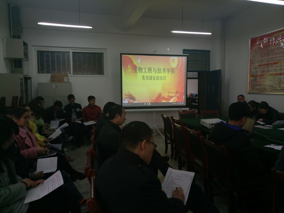 会议首先组织学习了党委组织部《关于展3月份“党员固定活动日”主题活动的通知》文件精神,接着党总支书记马纲做了“贯彻落实《准则》《条例》,坚持从严治党”专题讲座。讲座后,教工党支部在3号实验楼312会议室、学生支部在3号实验楼414多媒体教室分别进行了公开承诺。党员围绕“做讲政治、有信念,讲规矩、有纪律,讲道德、有品行,讲奉献、有作为的合格党员”要求,结合各自岗位职责和能力特长,着重从坚定信念、履职尽责、改进作风、但当作为、规范言行、遵章守纪等方面进行承诺。