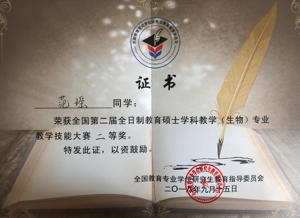 新葡官网教育硕士范瑶荣获2018年全国全日制教育硕士生物专业教学大赛二等奖